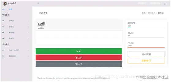 - 用户可以点击收藏,认识,不认识,下一个等按钮进行学习