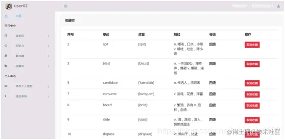 进入指定四六级背单词页面,可以实现对一些不太好记的单词 的收藏功能,也可以重新学习,对相应的不认识的单词将来重点学习。
