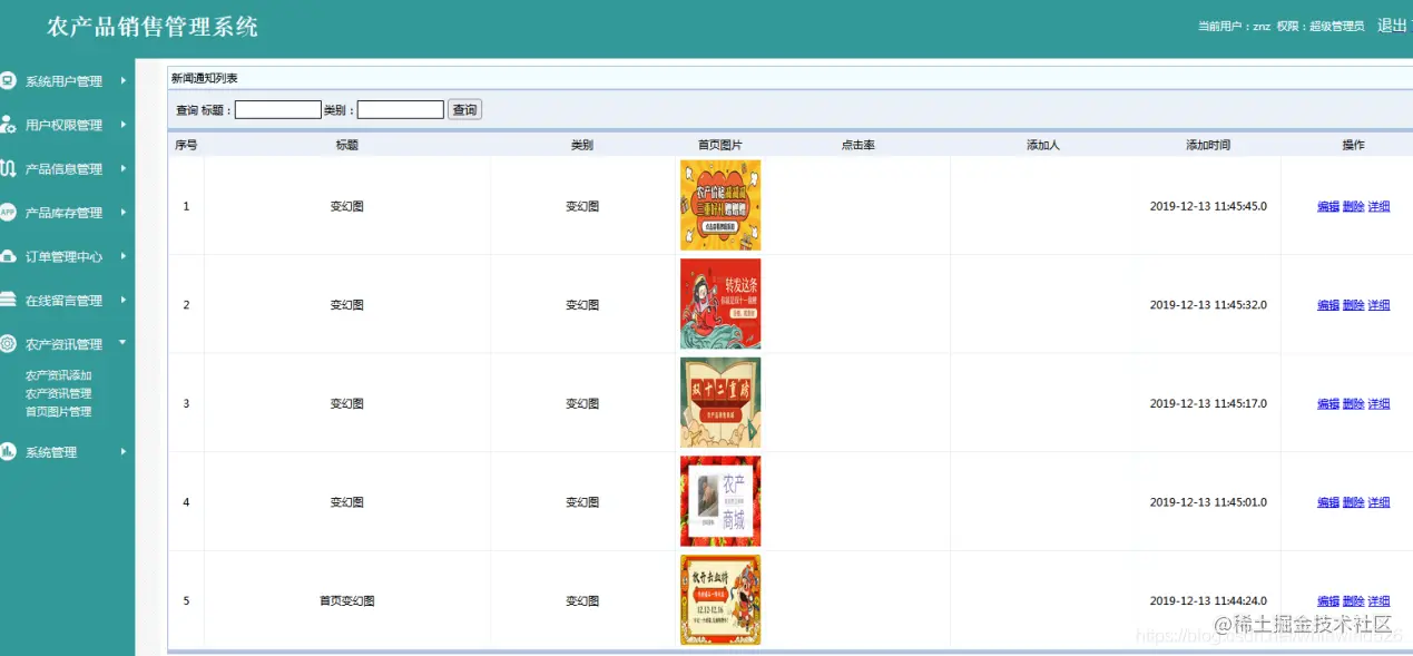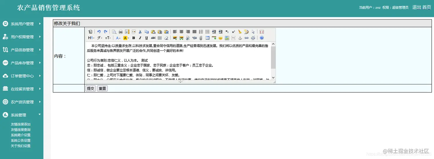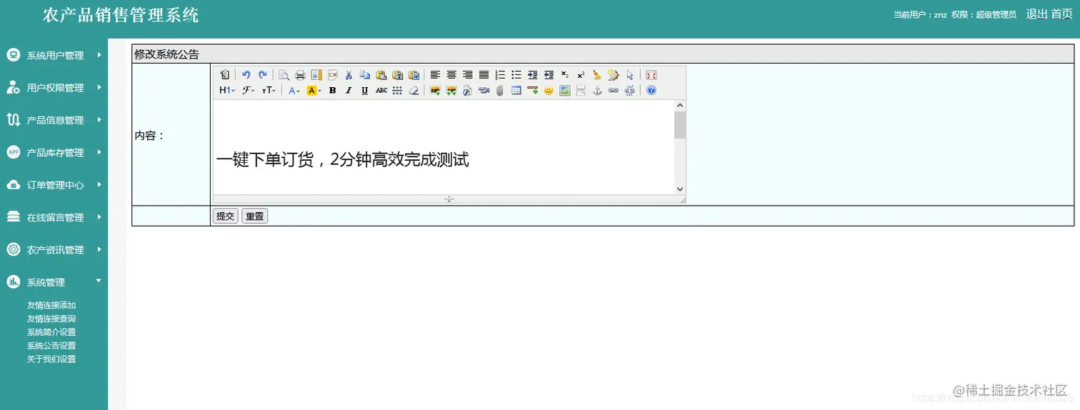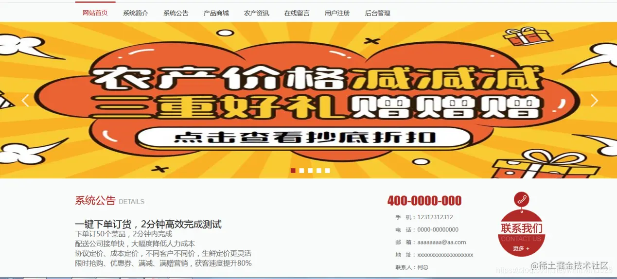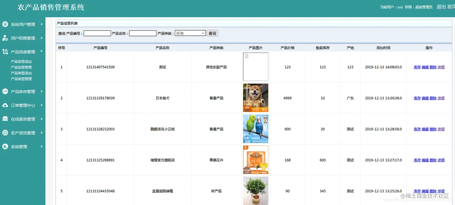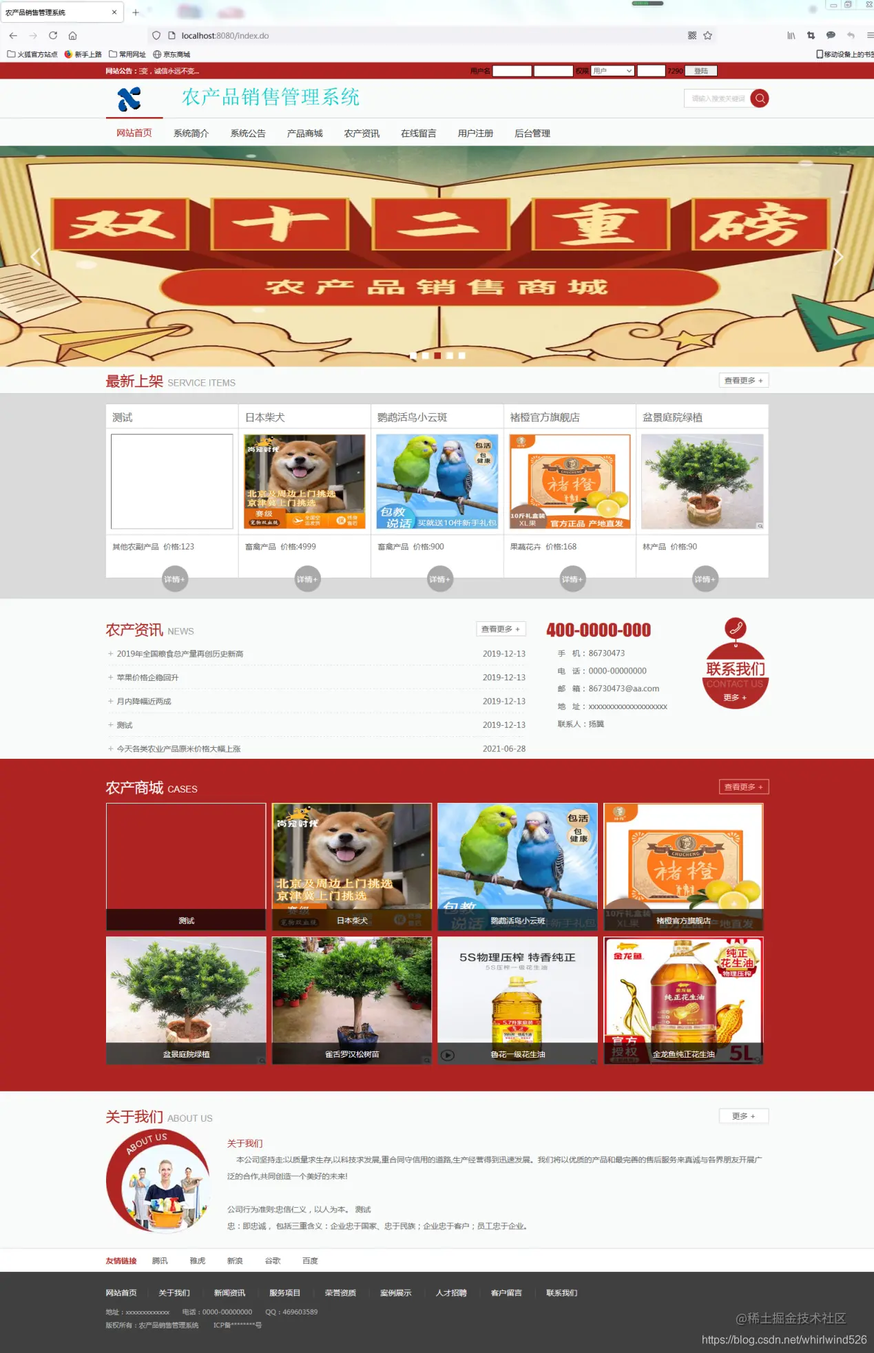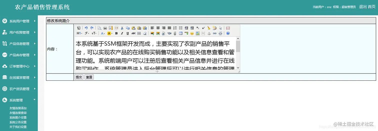 本系统基于SSM框架开发而成,主要实现了农副产品的销售平台,可以实现农产品的在线购买销售功能以及相关信息查看和管理功能。系统前端用户可以注册后查看相关产品信息并进行在线购买操作,系统管理员进入后台管理后可以进行相关信息的管理操作功能。