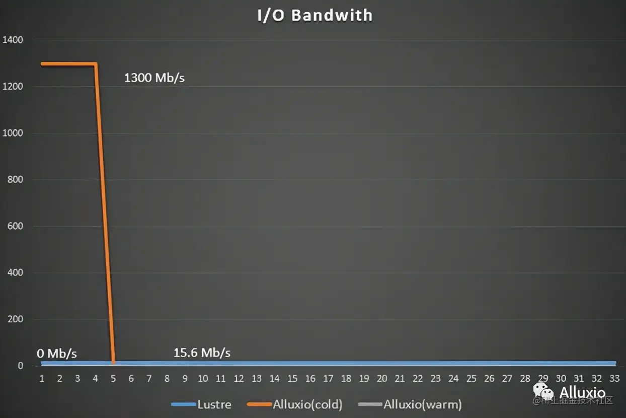 我们发现采用预热的 Alluxio 节点的 IO 带宽流量相比于直接从底层分布式存储读取从 1300Mb/s 降为基本为0,对于我们的平台收益是非常大的,在不增加底层存储硬件的情况下,这是最快而且相对廉价的降低存储系统带宽使用的方法。