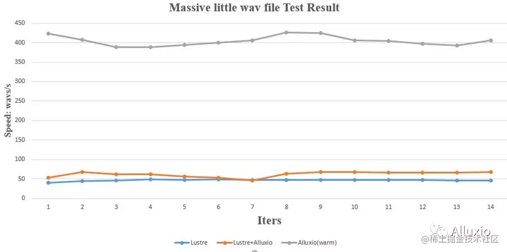 通过第一轮的时间可以看出,进行了 warmup 的缓存任务相比于直接从底层文件系统读取或者 Alluxio 的第一轮读取速度有了接近 10 倍的提速。Alluxio 在第一轮训练的时候由于数据需要做元数据同步与缓存数据,因此在第一轮数据读取的时候缓存的优势还体现不出来。但是当第二轮读取的时候,由于数据已经全部落入缓存介质中,这时候考验的就是 Alluxio 本身的缓存命中率,通过上面的实验结果也可以看出,增速非常明显。