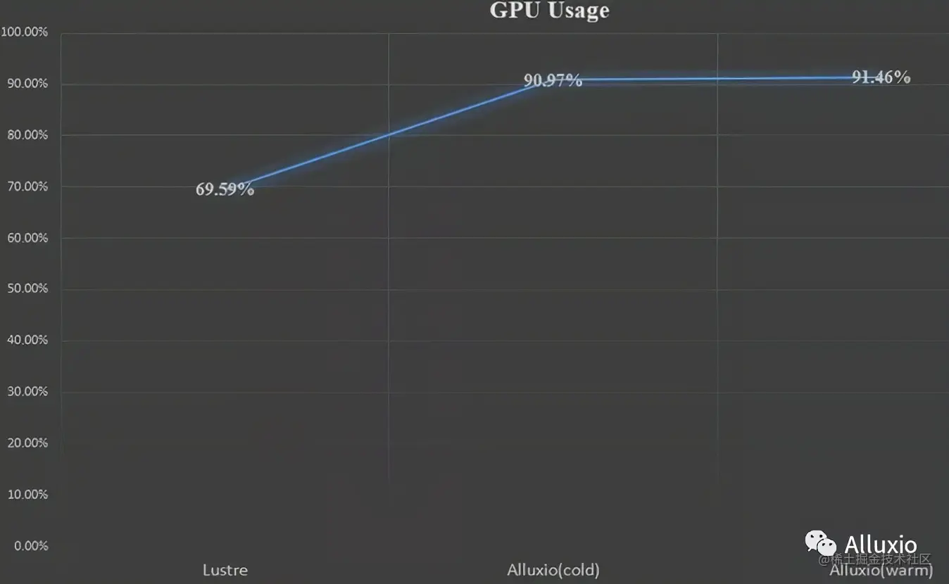 数据读取效率提升之后,整体 GPU 利用率也得到了提升,通过监控 GPU 的利用率发现采用 WarmUp 的 Alluxio 缓存,GPU 的利用率基本稳定在 90% 左右,同时我们看到数据缓存在内存中能够有效的降低底层存储的负载。