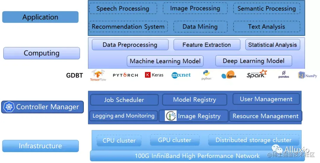 Atlas 计算平台采用是计算与存储分离的架构,目前整个平台的存储服务器、计算服务器之间以及计算与存储服务器之间的底层网络架构是由 100GB 的 InfiniBand 进行互联。