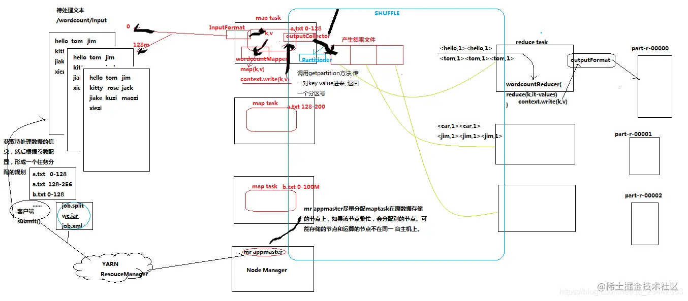 用户编写的程序分成三个部分:Mapper,Reducer,Driver(提交运行mr程序的客户端)