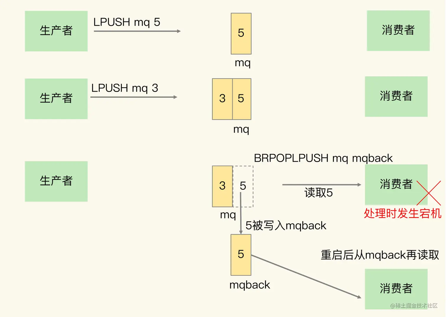 - BRPOPLPUSH 将消息再插入到另一个List 备份List