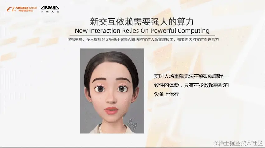 相信这个场景大家已经看过,利用云端的处理,我们实现了虚拟会议室,通过云端的 MCU 将所有人进行抠图 + 贴图,来提升视频会议时的参会体验,这是阿里内部开会时已经可以运用到、并看到的技术。