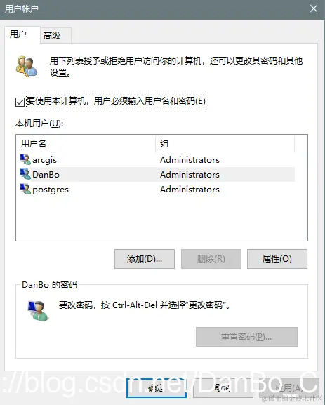 win+r打开运行输入control userpasswords2,可见用户账户,将arcgis和postgres都放在管理组中即可
