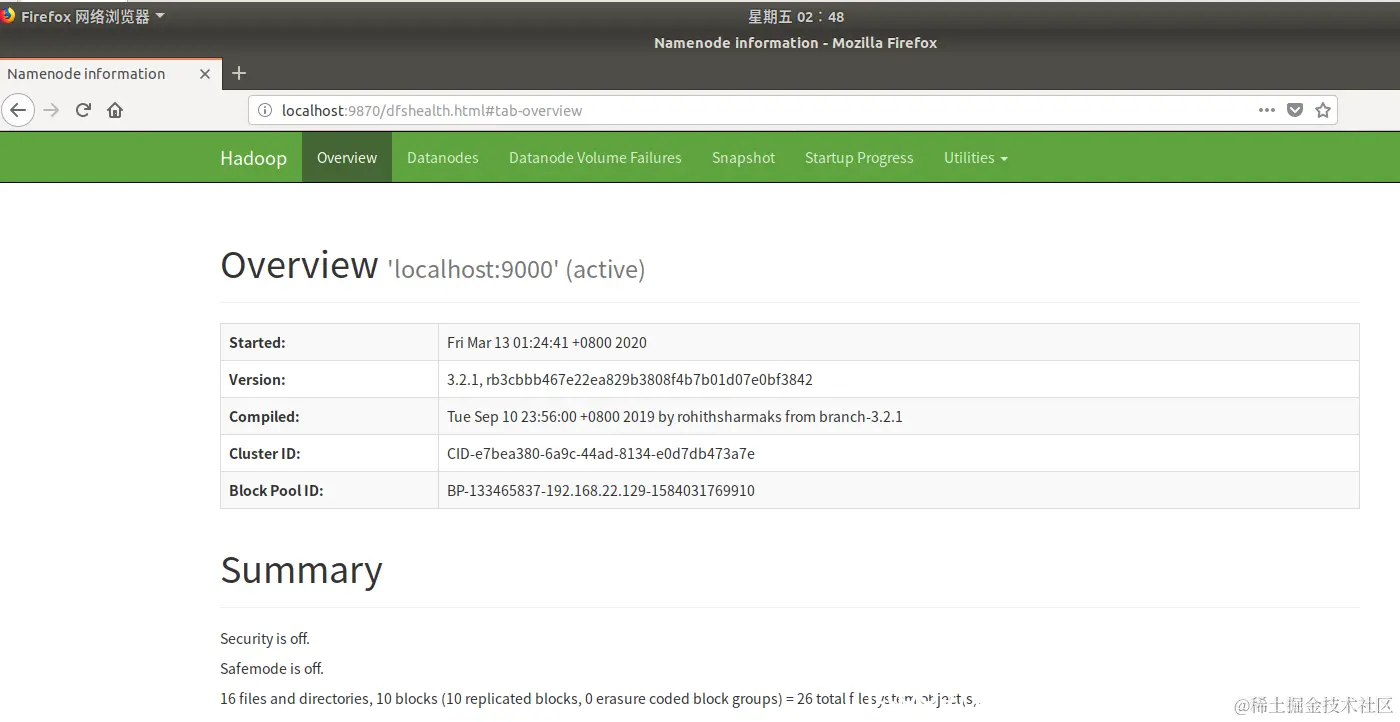 9. 在浏览器中输入http://localhost:9870,3.x版本中端口已经从50070改为了9870,配置文件中已经修改了。50070访问不到,踩坑!!!多看官网,受益匪浅