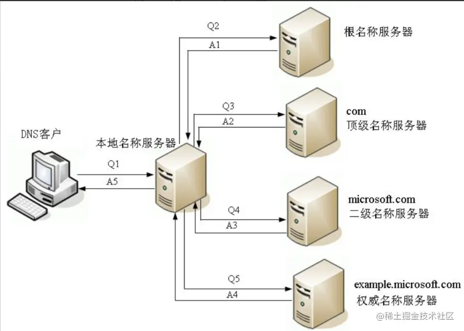 首先客户端向本地域名服务器发起请求,如果本地域名服务器没有缓存记录,客户端便会依次对根域名服务器、顶级域名服务器和二级域名服务器等发起迭代查询,直到获得最终的查询结果。