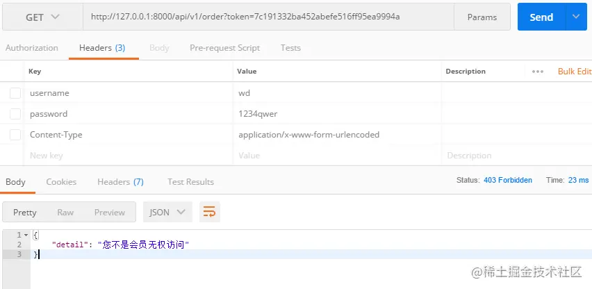 验证:订单业务同样使用user_type=1的用户进行验证,这里使用工具postman发送请求验证,结果如下:证明我们的权限生效了。