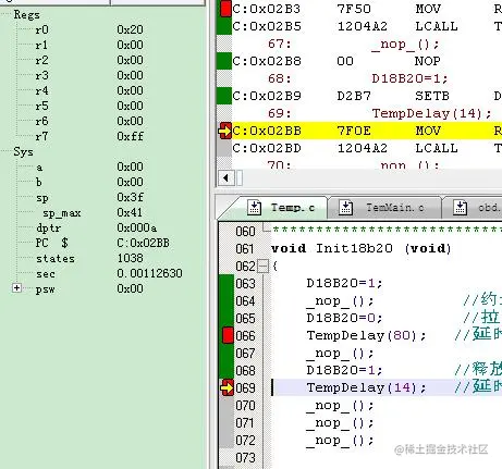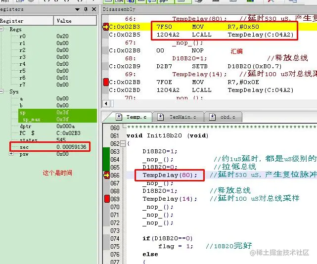 5、执行了TempDelay(14)后,变为0.00122938s,用时0.00010308s=103.08uS
