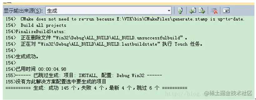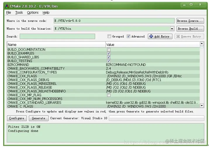 显示Generatingdone后完成,产生相应的VTK.sln 解决方案,退出Cmake即可。