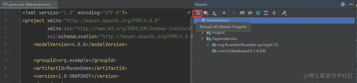 如果 pom.xml 没有自动更新依赖,那么可以打开maven窗口,点击刷新图标进行手动更新,如下所示: