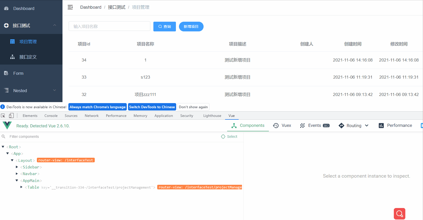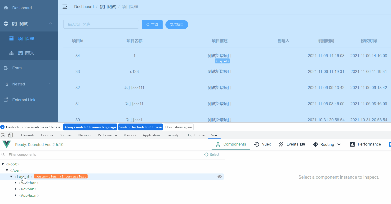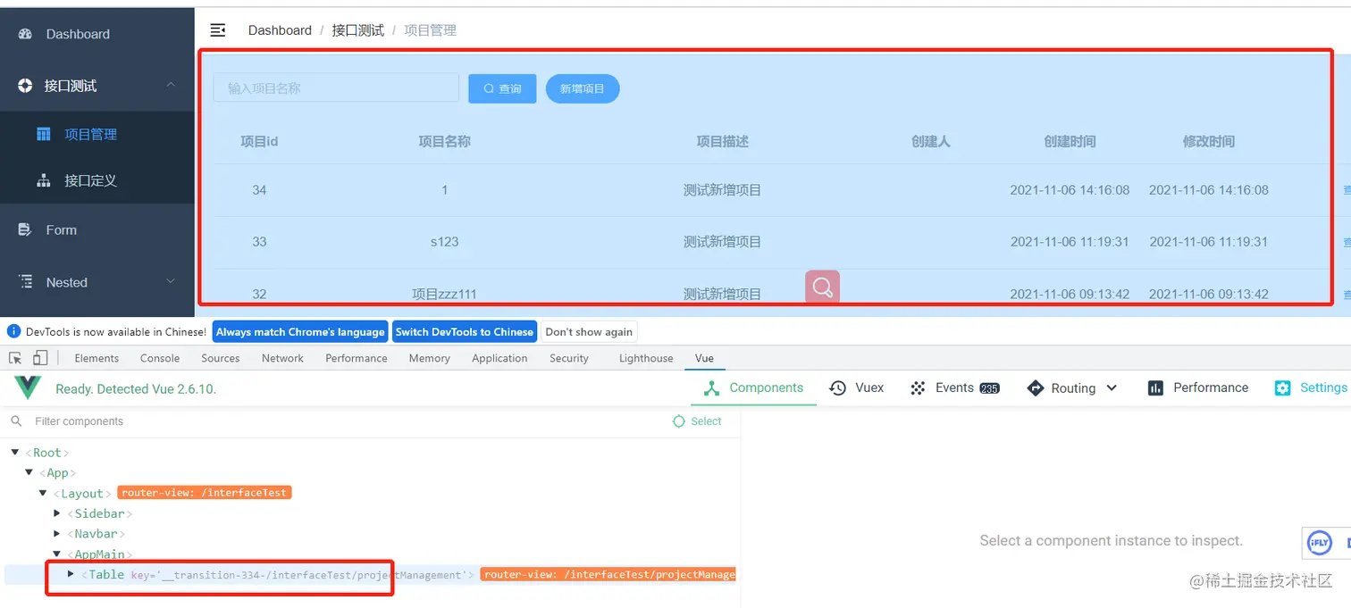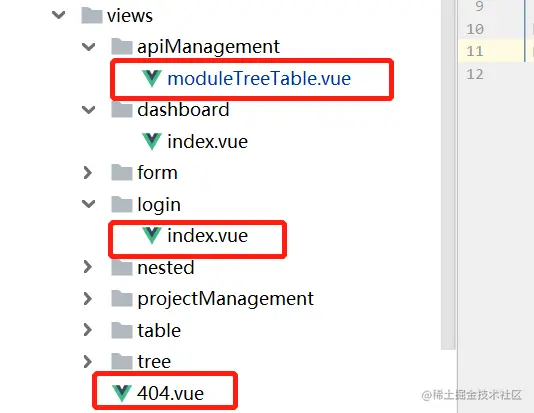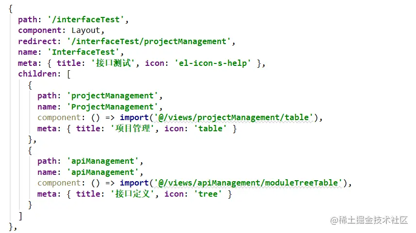 那么现在/interfaceTest/apiManagement,这个路由对应的组件就是@/views/apiManagement/moduleTreeTable,会显示到主内容区域。
