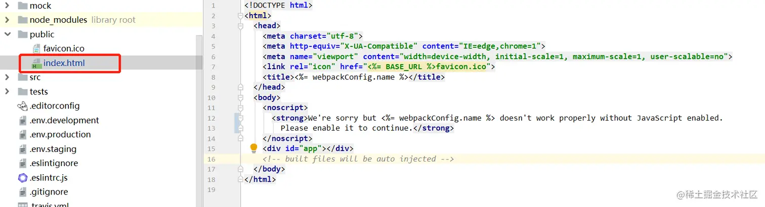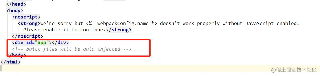注意,在这个 html 中,有一个<div id="app">,生成的文件都会自动注入到这里。