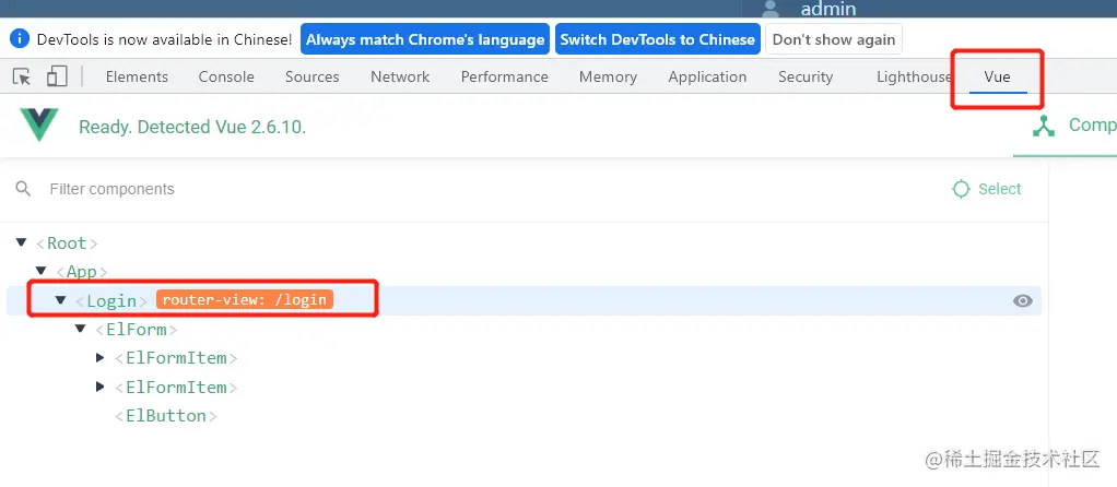 如果 chrome装了vue.js devtools插件,在登录页面按F12 可以看到组件嵌套详细: