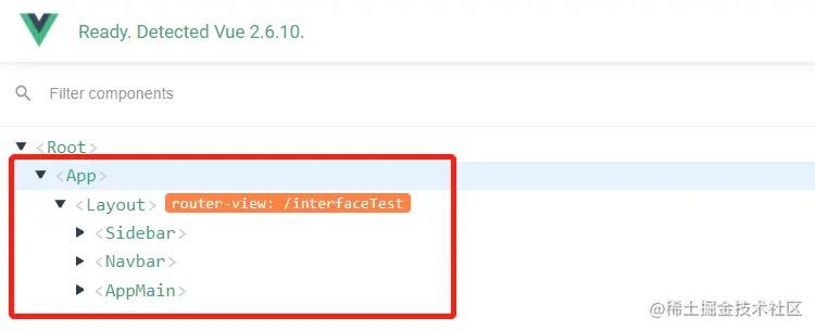 所以现在来看到话,App.vue下面嵌套着Layout, Layout下面又嵌套着上面这3样。