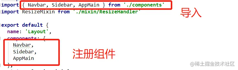 从./components中导入了3个子组件,然后注册子组件。