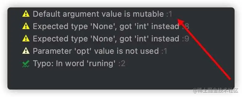 可以发现,调用两次函数 do_something,虽然并没有传入 arg 参数,arg 的值已经发送了变化。如果不注意这点,可能会有 bug 发生。在 Pythcarm 中,会警告我们 arg 是可变对象: