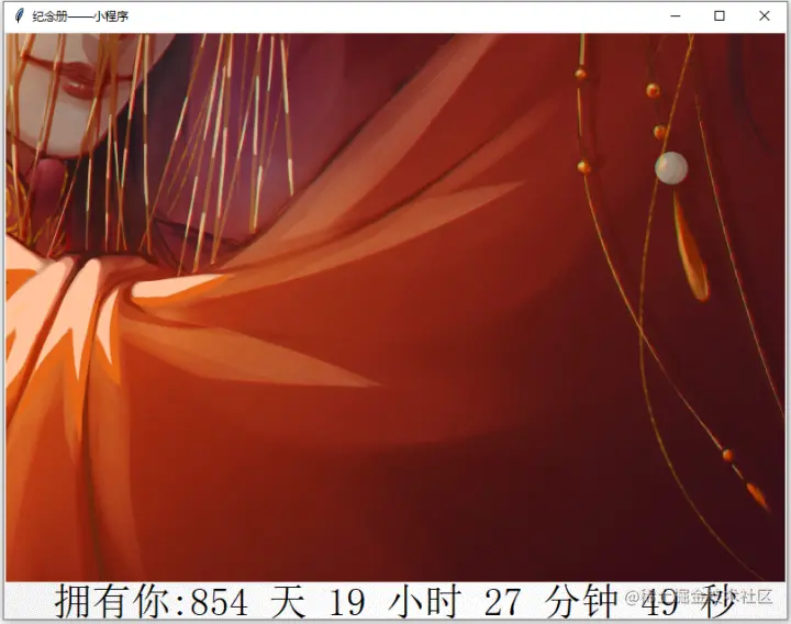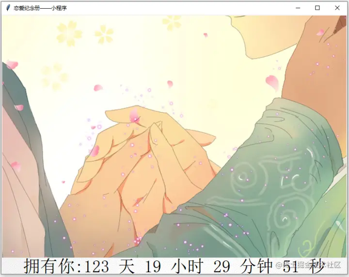 timer = '拥有你:'+str(day)+' 天 '+str(hour)+' 小时 '+str(min_)+' 分钟 '+str(sec)+' 秒'