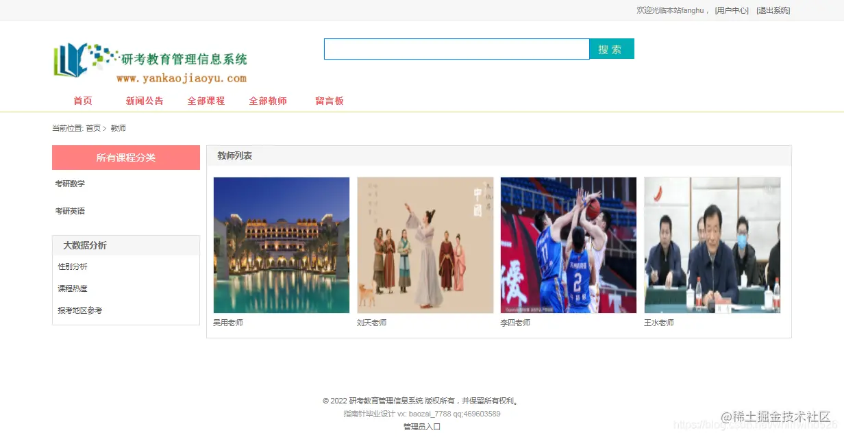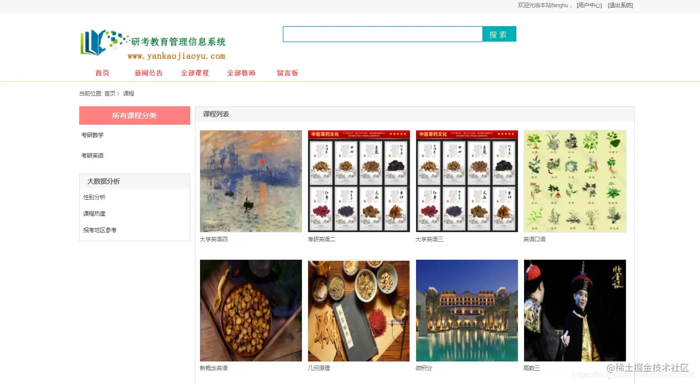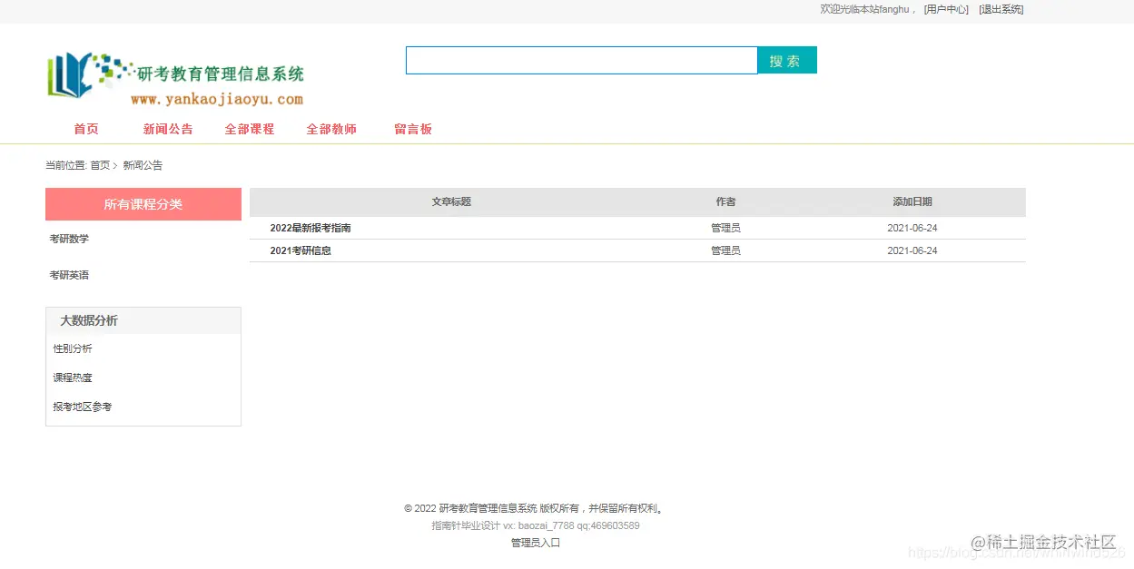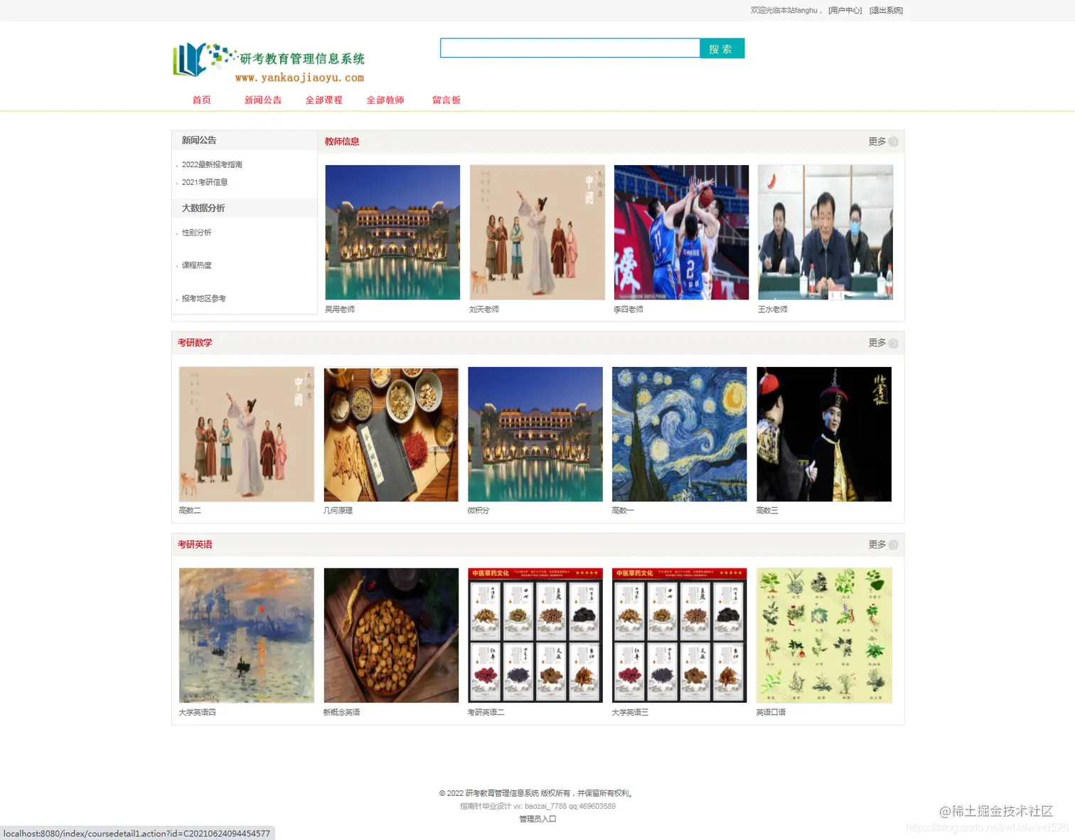 本项目基于SSM框架开发而成,主要实现考研信息管理和考研教学管理,系统分为前端和后台管理,前端用户可以实现在线查看最新考研信息,查看平台考研培训的老师信息,查看相关课程信息并进行购买,并可以在系统前端查看最新针对考研的大数据分析,从性别,报考区域,以及所学热门课程进行相关的图形化报表数据展示。系统后台用户主要实现用户管理、课程管理、老师管理、课表管理、公告管理等信息管理功能。