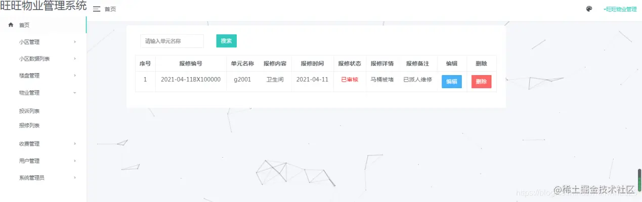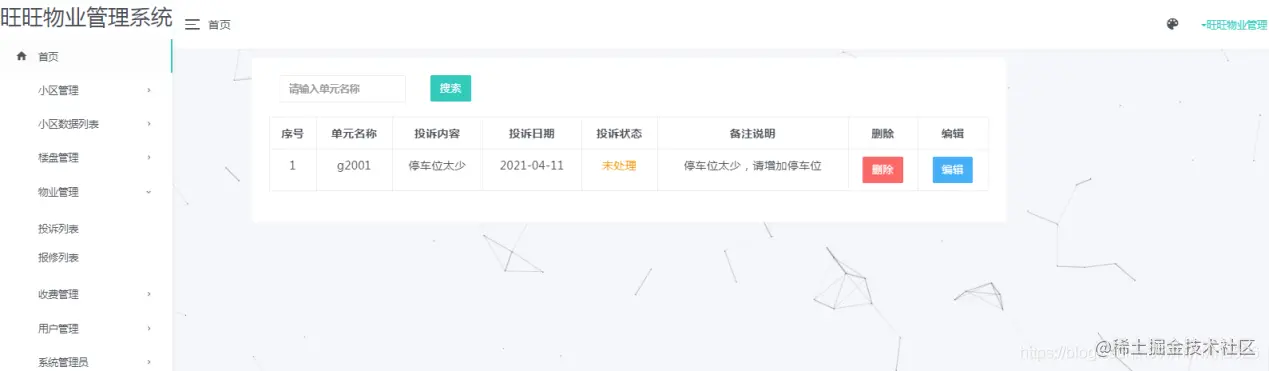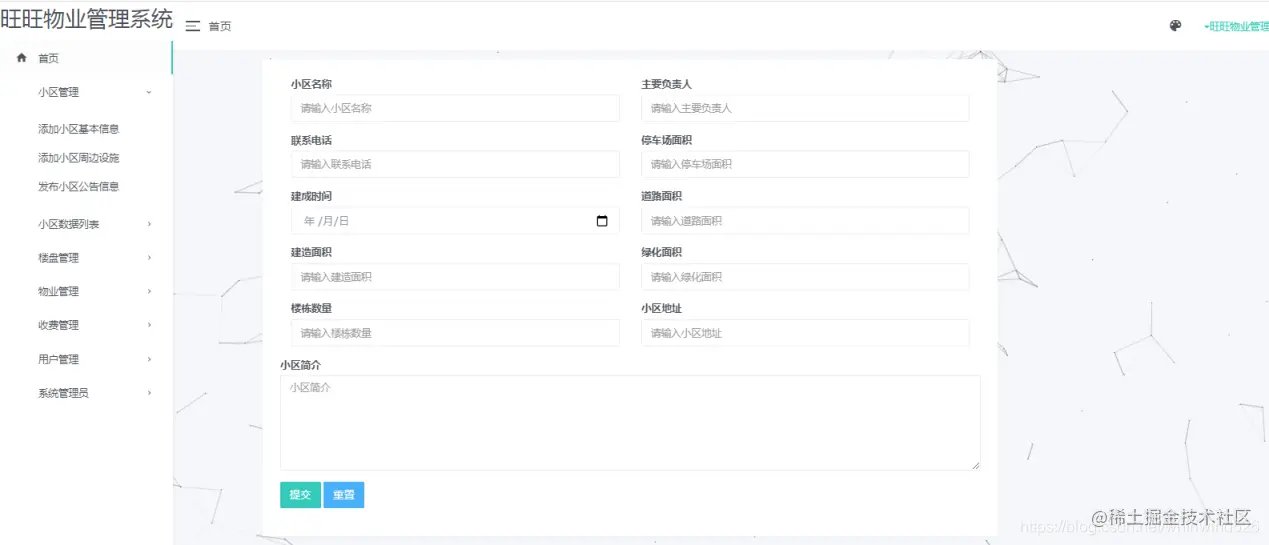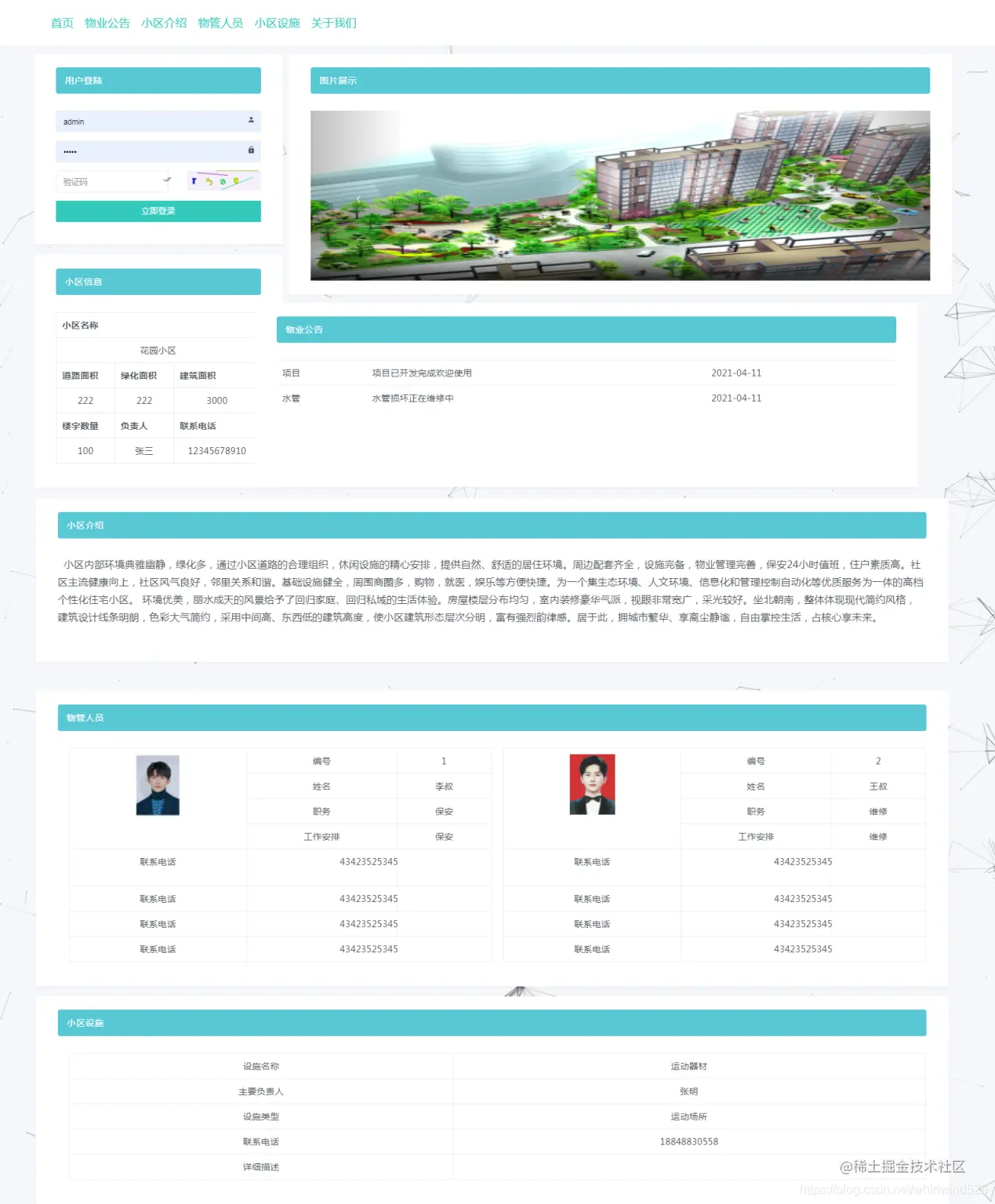 小区管理:可以添加小区信息、设施信息、公告信息
