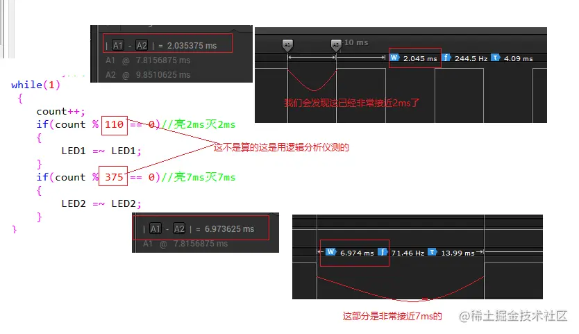 第1 个灯: 亮 2ms、 、 灭 2ms、 、 亮 2ms、 、 灭 2ms ,循环 。 第2 个灯: 亮 7ms、 、 灭 7ms、 、 亮 7ms、 、 灭 7ms ,循环 。 第3 个灯: 亮 97ms 、 灭 97ms 、 亮 97ms 、 灭 97ms, , 循环 。 这样的任务,不用定时器, 又该怎么写?