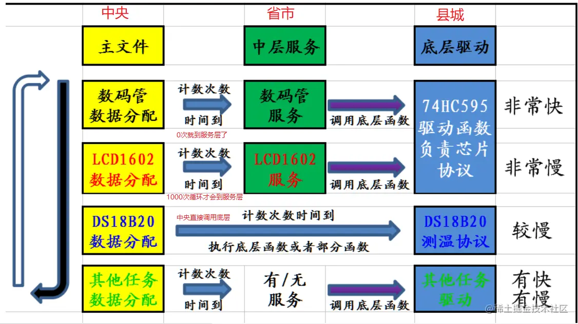 1、每个电路模块单独文件写代码, 需要则包含。 2、用定时器时间来分配任务时间。 3、文件与文件之间函数允许互相调用。 4、各模块之间的数据 互相调用。 5、没有严格规范代码书写要求,可阅读性不高。 6、程序效率较高,程序可移植性较高。 缺点:管理上还是有点乱