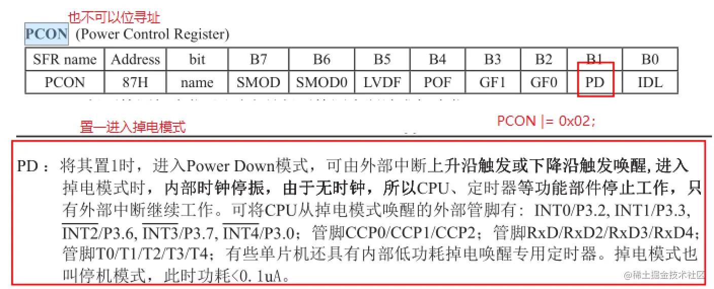 5.后把寄存器PCON第一位PD置1,单片机进入掉电模式