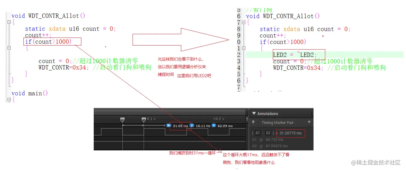 3.在定时器溢出之前,把看门狗计数器清零(喂狗)