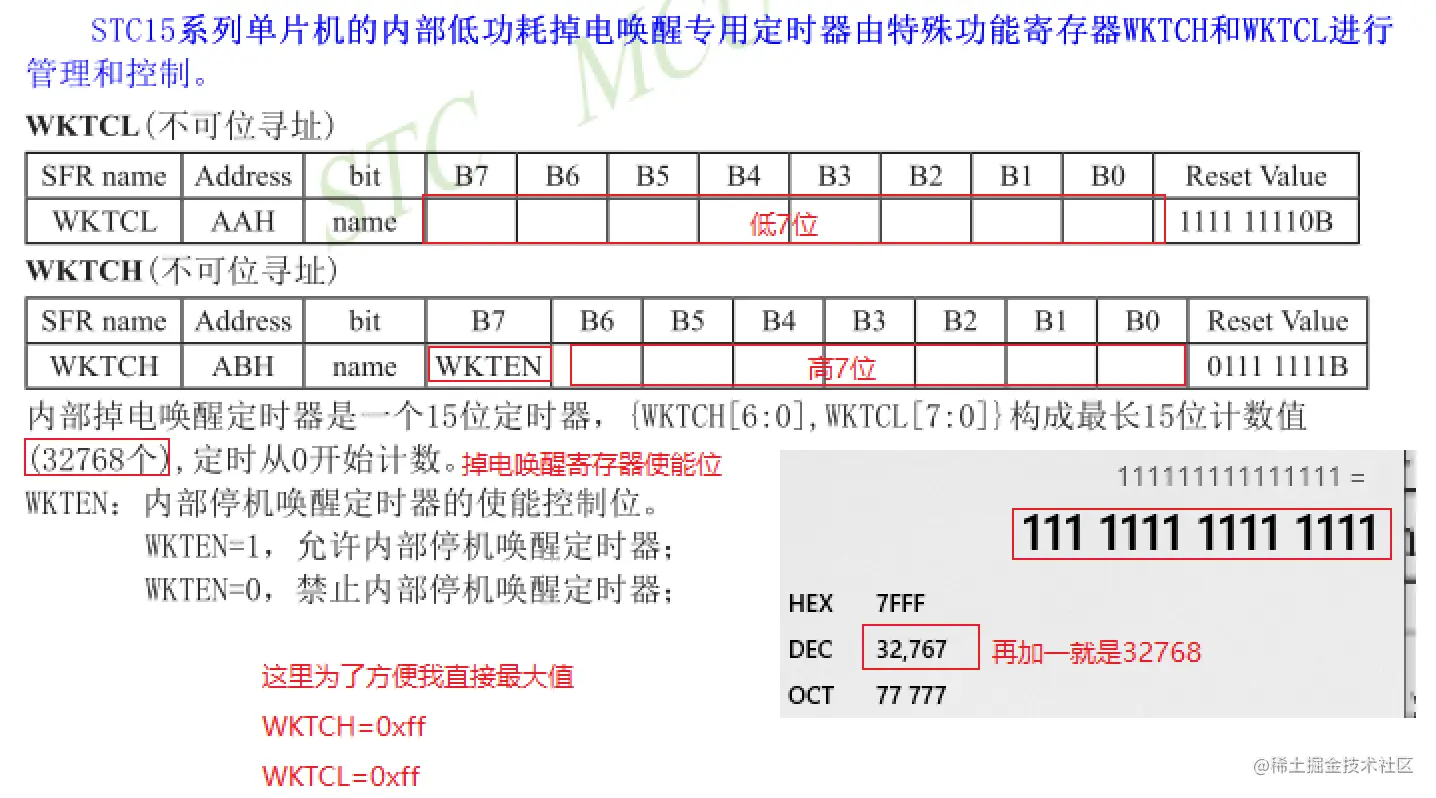 1.调电停机唤醒专用15位定时器:WKTCH(高七位),WKTCL(低8位)