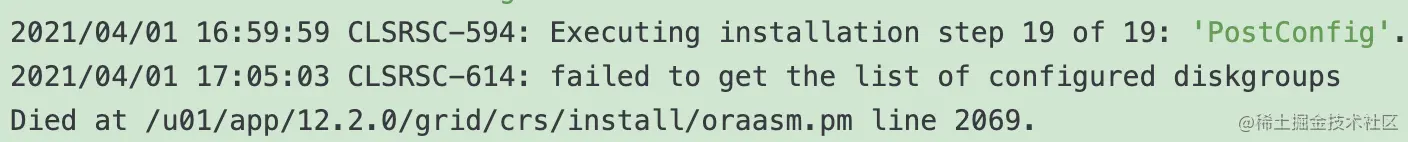 此坑是修复以上两个坑之后,root.sh执行到进度19/19时,突然停止,并报错如上,显示root.sh执行失败。