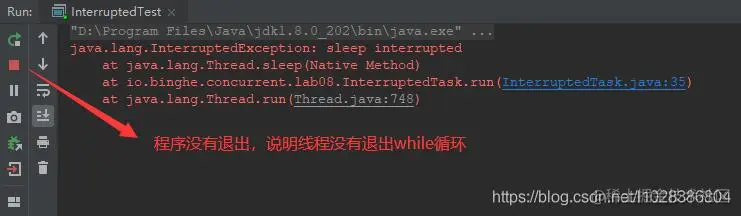 上述代码明明调用了线程的interrupt()方法来中断线程,但是却并没有起到啥作用。原因是线程的run()方法在执行的时候,大部分时间都是阻塞在sleep(100)上,当其他线程通过调用执行线程的interrupt()方法来中断执行线程时,大概率的会触发InterruptedException异常,在触发InterruptedException异常的同时,JVM会同时把线程的中断标志位清除,所以,这个时候在run()方法中判断的currentThread.isInterrupted()会返回false,也就不会退出当前while循环了。