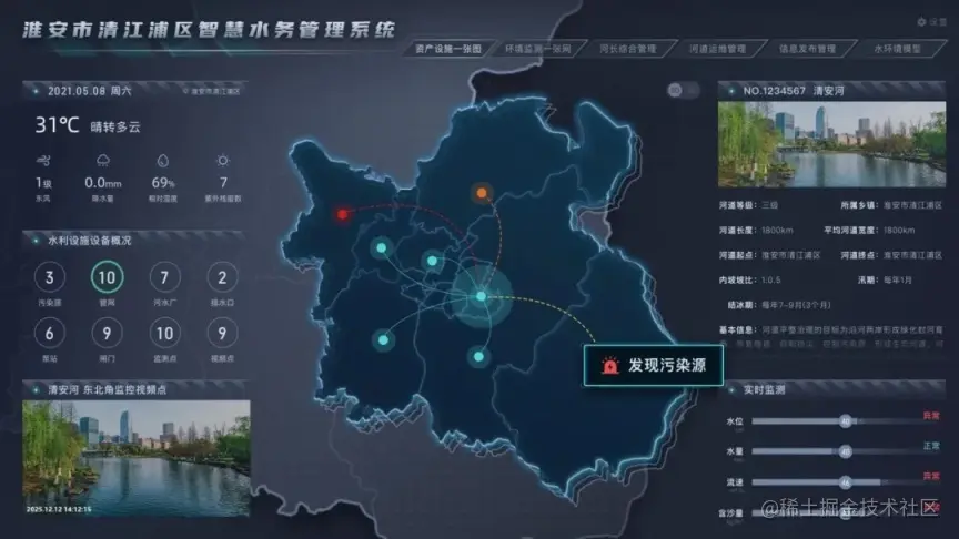 作为数研院第一个自主研发的项目,淮安智慧水务项目需要实现对数十条河道的实时监测和预警,其中包含水质监测箱、液位仪、流量计、雨量计、截流井监测计、水泵等多种设备的数据采集和分析。