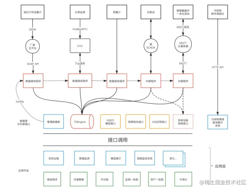 我们在各个厂商的云平台、DTU/RTU 设备、SCADA 系统与 TDengine 之间搭建了一个数据中间件,用于处理各种协议和接口,初步解决了各类设备的接入问题,后期会考虑自建一个物联网云平台,并接入 TDengine 集群,对接所有智慧类项目的物联网数据。