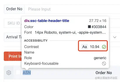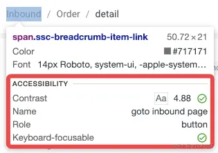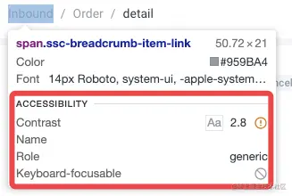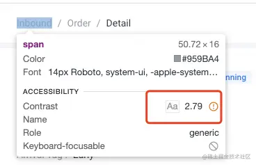 这一块清晰地描述了这个按钮在可访问性相关的一些特性。比如 Contrast(色彩对比度)、Name(按钮的描述),是给屏幕阅读器看到的;Role 标识是这个元素的属性,它是一个按钮,Keyboard focusable 则表明能否被键盘的 Tab 按钮捕获。