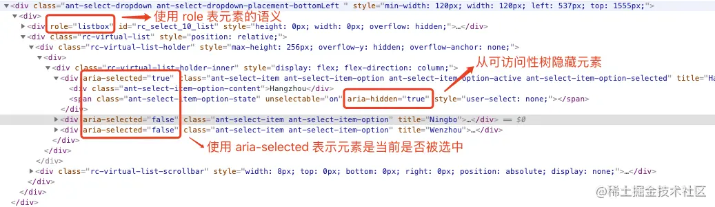 以 Select 选择框组件为例,ant-design 利用了大量的 WAI-ARIA 属性,使得用 div 模拟的下拉框不仅仅在表现上符合一个下拉框,在语义、行为上都符合一个下拉框。