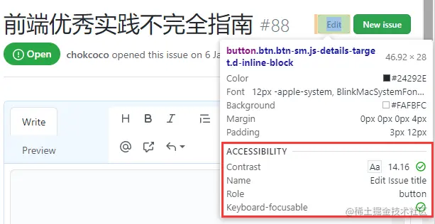 我们来看看 Github 页面是如何定义一个按钮的。以 Github Issues 页面的 Edit 按钮为例: