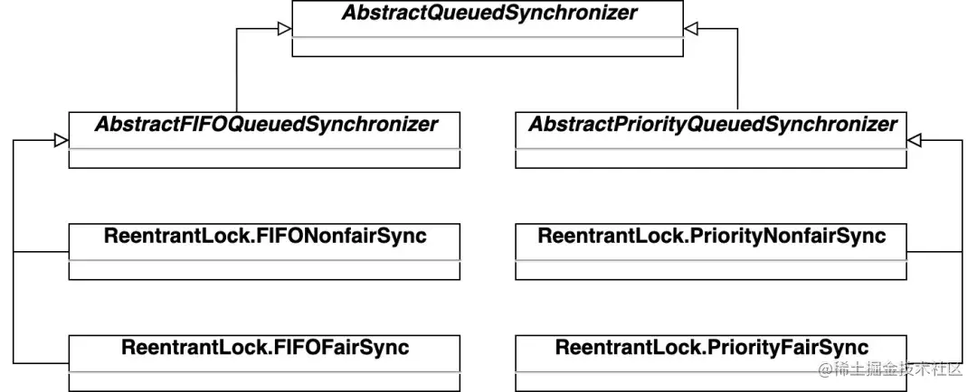 可以看到,AQS骨架代码为其子类的具体实现封装并屏蔽了复杂的FIFO队列和线程控制逻辑。ReentrantLock中的AQS实例只需实现其中的个性化逻辑部分:tryAcquire和tryRelease方法。比如在tryAcquire方法中,如果发现同步状态为0,会尝试以CAS的方式更新同步状态为1,以获取锁;如果发现同步状态大于0,且当前线程就是持有锁的线程,则会将同步状态加1,表示锁的重入;否则方法返回false,表示获取锁失败。而其中非公平性锁(ReentrantLock.NonfairSync)和公平性锁(ReentrantLock.FairSync)的区别主要在于,公平性锁在尝试获取锁时,会检查是否已有其他线程先于当前线程等待获取锁,如果没有,才会按照前述的方式尝试加锁。下图是ReentrantLock中AQS具体实现的类图(中间有一层额外的ReentrantLock.Sync,主要是为了部分代码的复用而设计)。