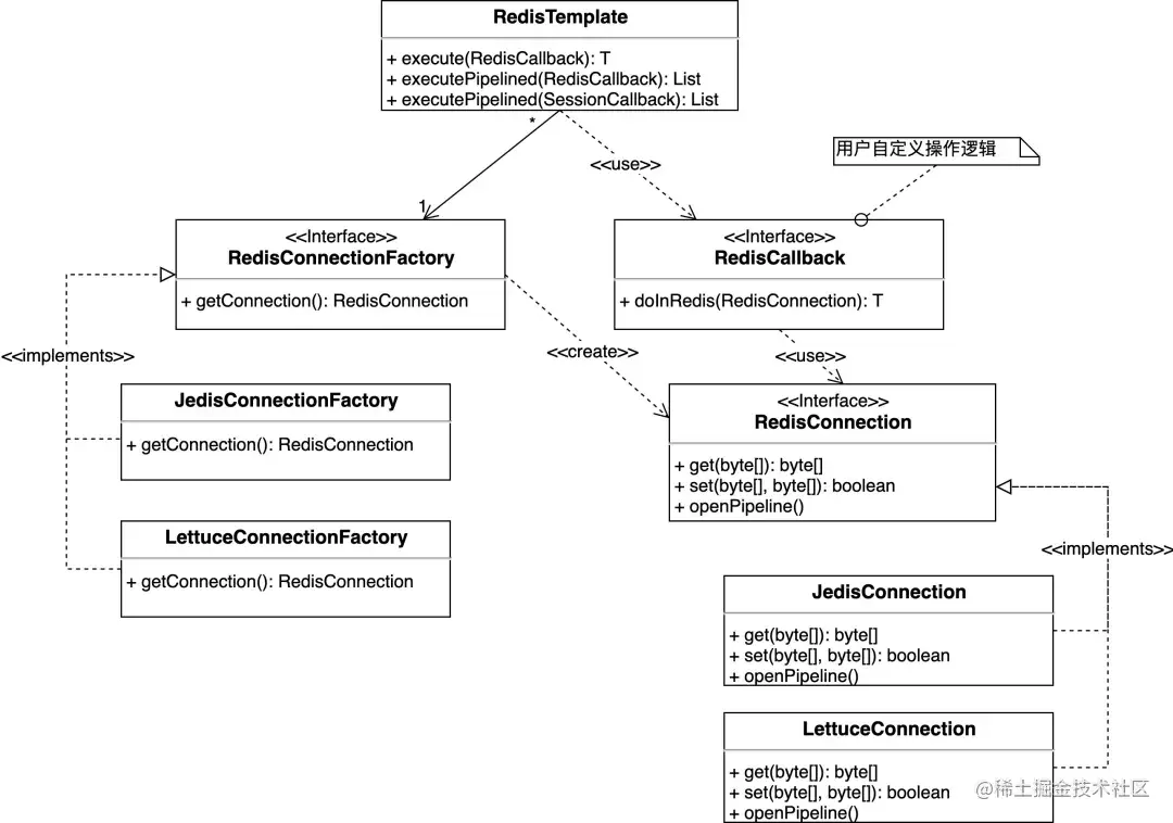 如下述RedisTemplate中的管道模式命令执行方法,其中的RedisCallback< ?> action参数即是作为函数式回调接口,接收用户传入的具体实现(自定义Redis命令操作),并在管道模式下进行回调执行(action.doInRedis或session.execute)。同时,管道的打开和关闭(connection.openPipeline/connection.closePipeline)也支持不同的实现方式:如我们熟悉的JedisConnection和Spring Boot 2开始默认使用的LettuceConnection。值得注意的是,虽然在Spring框架中存在各类以Template后缀命名的类(如RedisTemplate、TransactionTemplate、JdbcTemplate等),但是仔细观察可以发现,它们实际上使用的并不是模板方法,而是回调的方式(注3)。