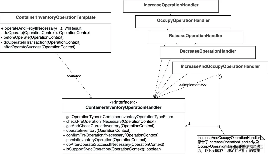 类似地,在数农WMS的库存操作重构中,我们定义了ContainerInventoryOperationTemplate「模板类」,作为承载库存操作业务逻辑的框架。下述为其中的库存操作核心代码片段。可以看到,框架统一定义了库存操作流程,并对其中的通用逻辑提供了支持,使各类不同的库存操作得以复用:如构建库存操作明细、持久化操作明细及同步任务、并发冲突重试等;而对于其中随不同库存操作类型变动的逻辑 —— 如操作库存数据、确认前置操作、持久化库存数据等 —— 则通过对ContainerInventoryOperationHandler接口实例的回调实现,它们可以被看作是库存操作框架代码中的扩展点。接口由不同类型的库存操作分别实现,如库存增加、库存占用、库存转移、库存释放等等。如此,如果我们后续需要添加某种新类型的库存操作,只需要实现ContainerInventoryOperationHandler接口中定义的个性化逻辑即可;而如果我们需要对整个库存操作流程进行迭代,也只需要修改ContainerInventoryOperationTemplate中的框架代码,而不是像先前那样,需要同时修改多处代码(这里模板类和库存操作handler的命名均以Container作为前缀,是因为数农WMS以容器托盘作为基本的库存管理单元)。