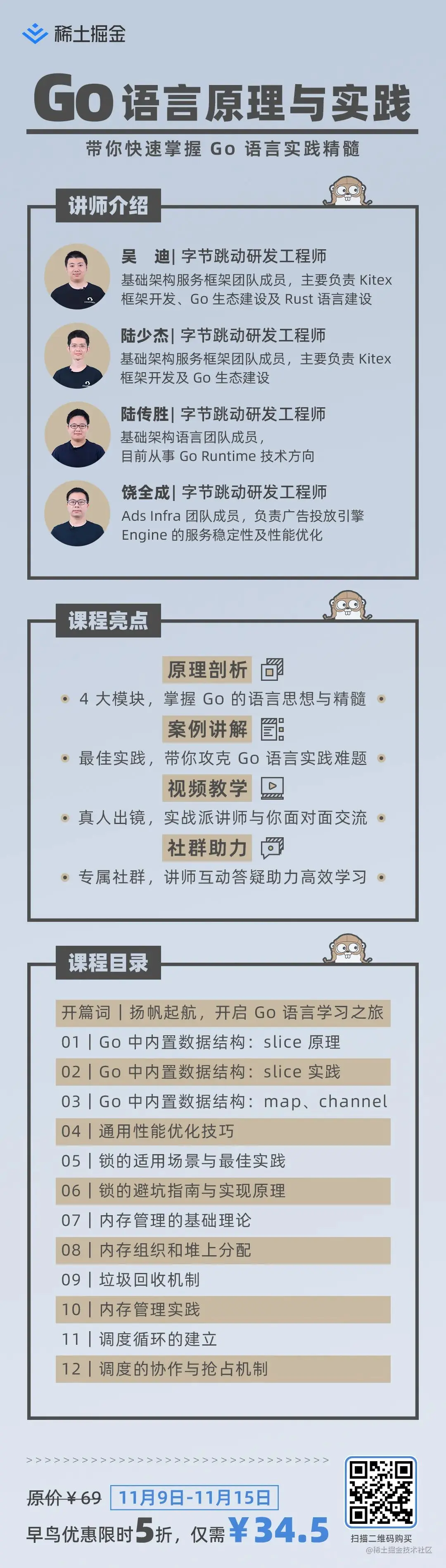 这门课程是由掘金与 4 位字节跳动研发工程师精心设计的,课程中各讲师真人出镜,有原理剖析,又有案例讲解,手把手带你攻克 Go 语言层面的难题。