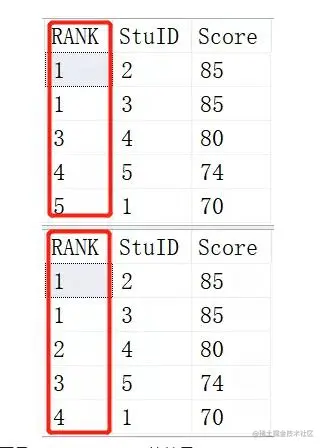 上面是RANK()的结果,下面是DENSE_RANK()的结果