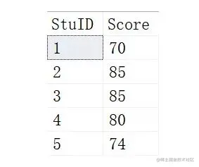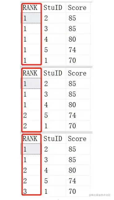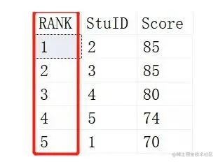 这里RANK就是每个学生的排名后的次序, 根据Score进行DESC倒序
