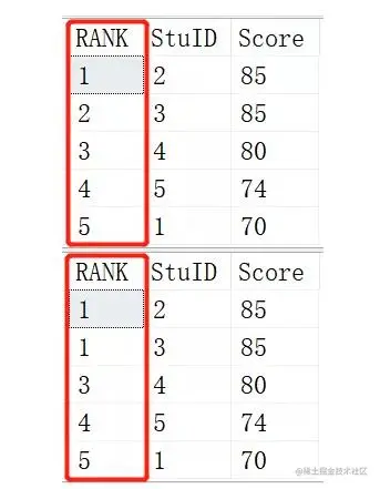 上面是ROW_NUMBER()函数的结果,下面是RANK()函数的结果。