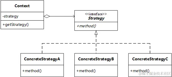 - Strategy:一个接口,定义了对外提供的方法;
