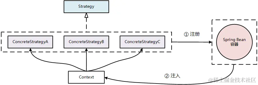 Context 在注入具体策略时可以从 Spring 容器中取出,Context 和 Strategy 之间实现了一步的解耦。