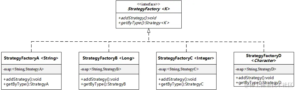这样,我们就有了 Strategy 接口和 StrategyFactory 接口的统一抽象,但是,在配置类 StrategyConfig 的 afterPropertiesSet 方法中,我们该怎么知道每个 StrategyFactory 类管理的是哪个 Strategy 接口呢?