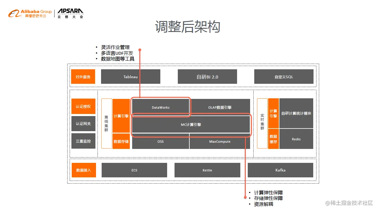调整最重要的环节在整个计算引擎的部分,把数据搬迁到了MaxCompute的平台上面,用DataWorks去做数据的调度和管理。 MaxCompute的使用带来了大幅的灵活性提升。