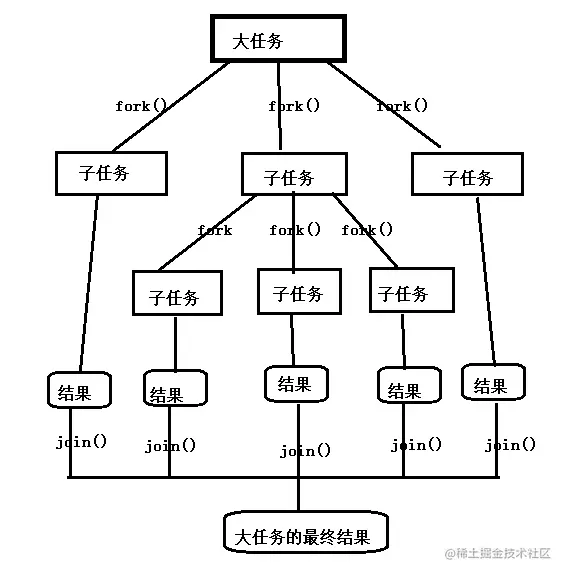 把一个大任务调用fork()方法分解为若干小的任务,把小任务的处理结果进行join()合并为大任务的结果。